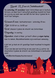 Zaterdag 16 november om 14:00 uur zal, als alles goed gaat, Sinterklaas met al zijn Pietende haven van Surhuisterveen binnenvaren. Na een kort welkom door